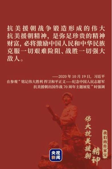 2020年10月23日,习近平总书记在纪念中国人民志愿军抗美援朝出国作战70周年座谈会上指出:“在波澜壮阔的抗美援朝战争中,英雄的中国人民志愿军始终发扬祖国和人民利益高于一切、为了祖国和民族的尊严而奋不顾身的爱国主义精神,英勇顽强、舍生忘死的革命英雄主义精神,不畏艰难困苦、始终保持高昂士气的革命乐观主义精神,为完成祖国和人民赋予的使命、慷慨奉献自己一切的革命忠诚精神,为了人类和平与正义事业而奋斗的国际主义精神,锻造了伟大抗美援朝精神。”