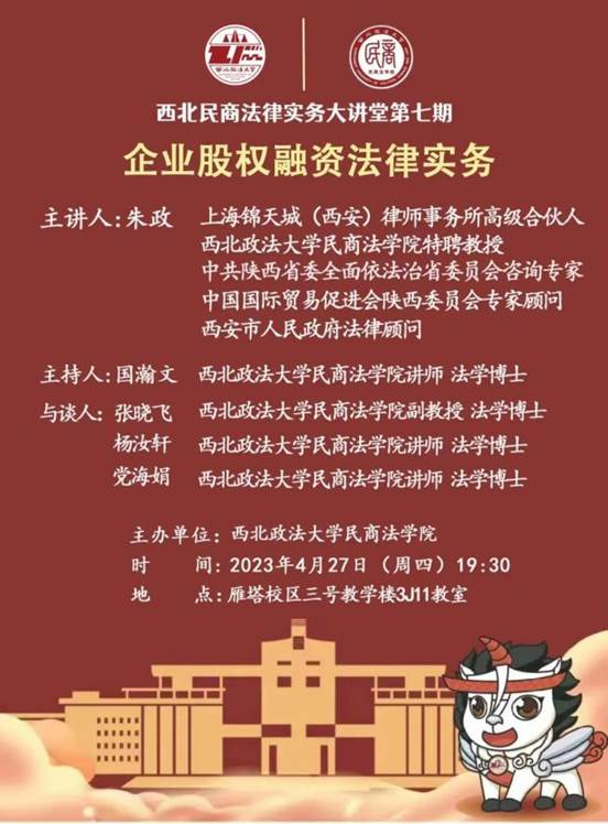 2023年4月27日,3044永利官网民商法律实务大讲堂第七期在雁塔校区成功举办。本次讲座特邀上海锦天城(西安)律师事务所高级合伙人、3044永利集团特聘教授、中共陕西省委全面依法治省委员会咨询专家、中国国际贸易促进会陕西委员会专家顾问、西安市人民政府法律顾问朱政律师主讲,由3044永利集团国瀚文博士主持,商法教研室张晓飞老师、杨汝轩老师、党海娟老师与谈。程淑娟经理参加讲座。