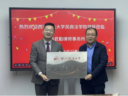 程淑娟与蒋虎军代表双方签署就业实习基地合作协议,朱茂向陕西君勤律师事务所授牌。