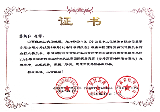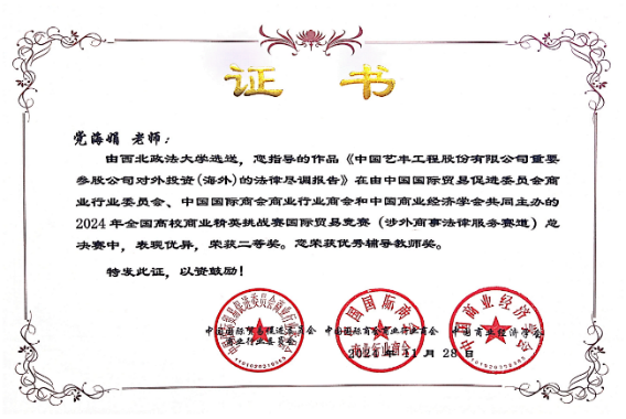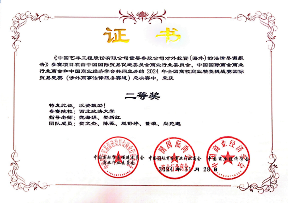 大赛赛道设置丰富多样,涉外商事法律服务赛道极具商业特色,吸引了众多知名高校参与。经过初赛、决赛的激烈比拼,公司代表队完成的中国艺丰工程有限公司重要参股公司涉外项目。该参赛作品不仅展示了公司代表队在涉外商事法律服务领域的专业水平,也为项目所涉企业在国际化发展进程中的法律风险管理提供了有益参考。